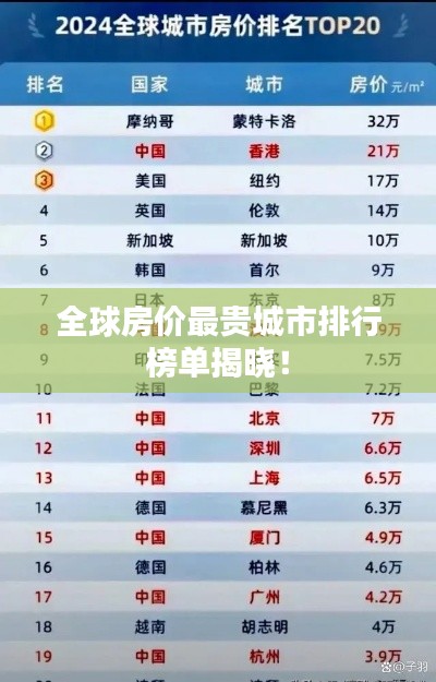 全球房价最贵的城市排名反映了这些城市的经济发展状况和资源吸引力,高房价也带来了诸多挑战,需要政府和社会各界共同努力,制定合理的政策,确保房地产市场的健康发展。
